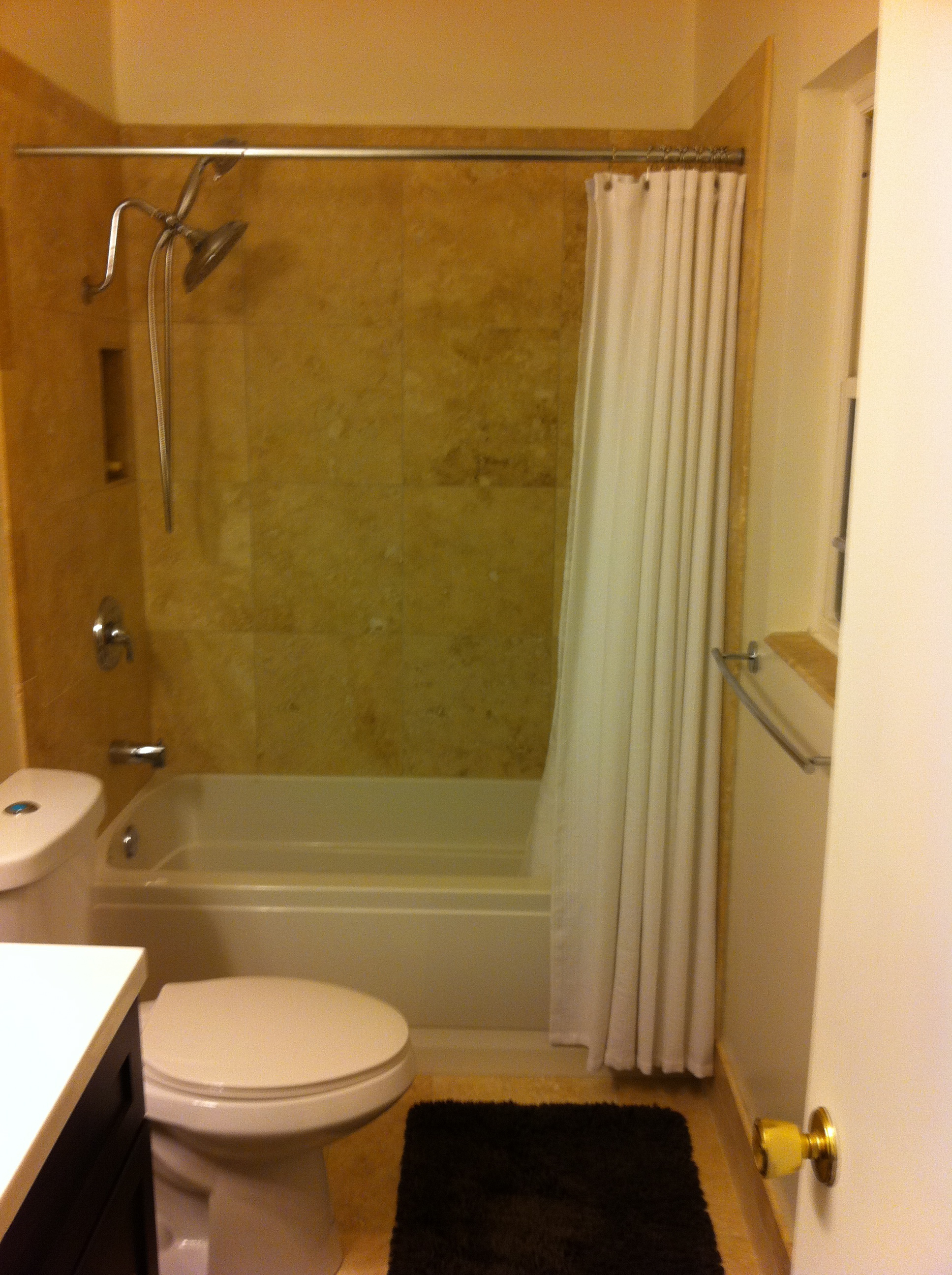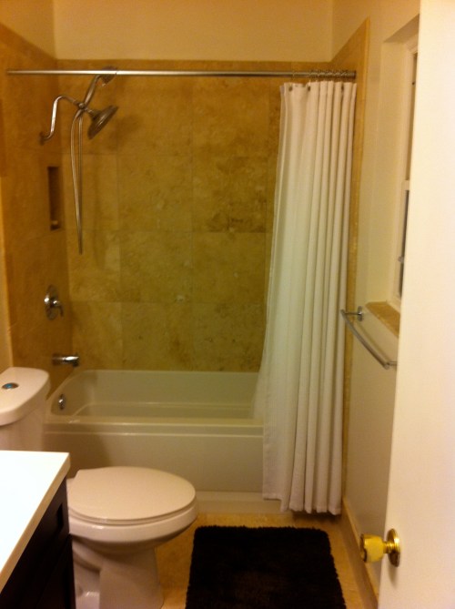 Spare bath pic #1 the peach tile replaced with nice travertine